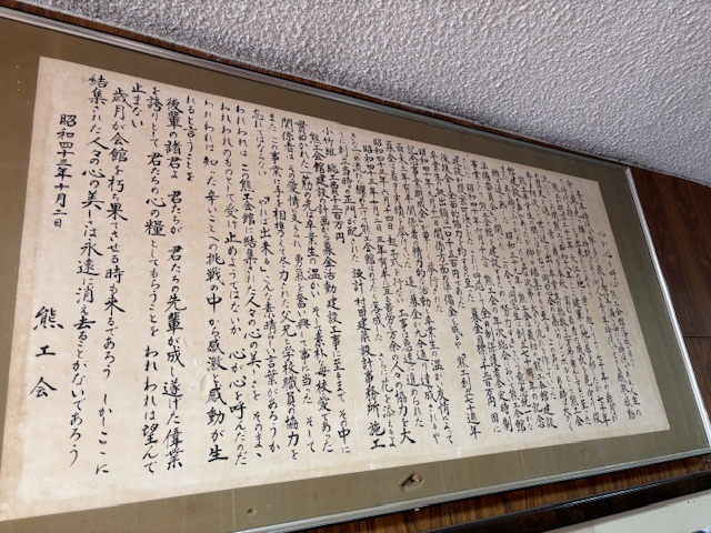 熊工創設70周年事業として、会館を造るに至った想いや、当時の在校生、保護者、学校職員、卒業生に向けての言葉が記されてます。文中に力強く【やれば出来る】の文言と結びの言葉として【歳月が会館を朽ち果てさせる時も来るであろう、しかしここに結集された人々の美しい心は永遠に消え去る事は無いであろう】と記されています。