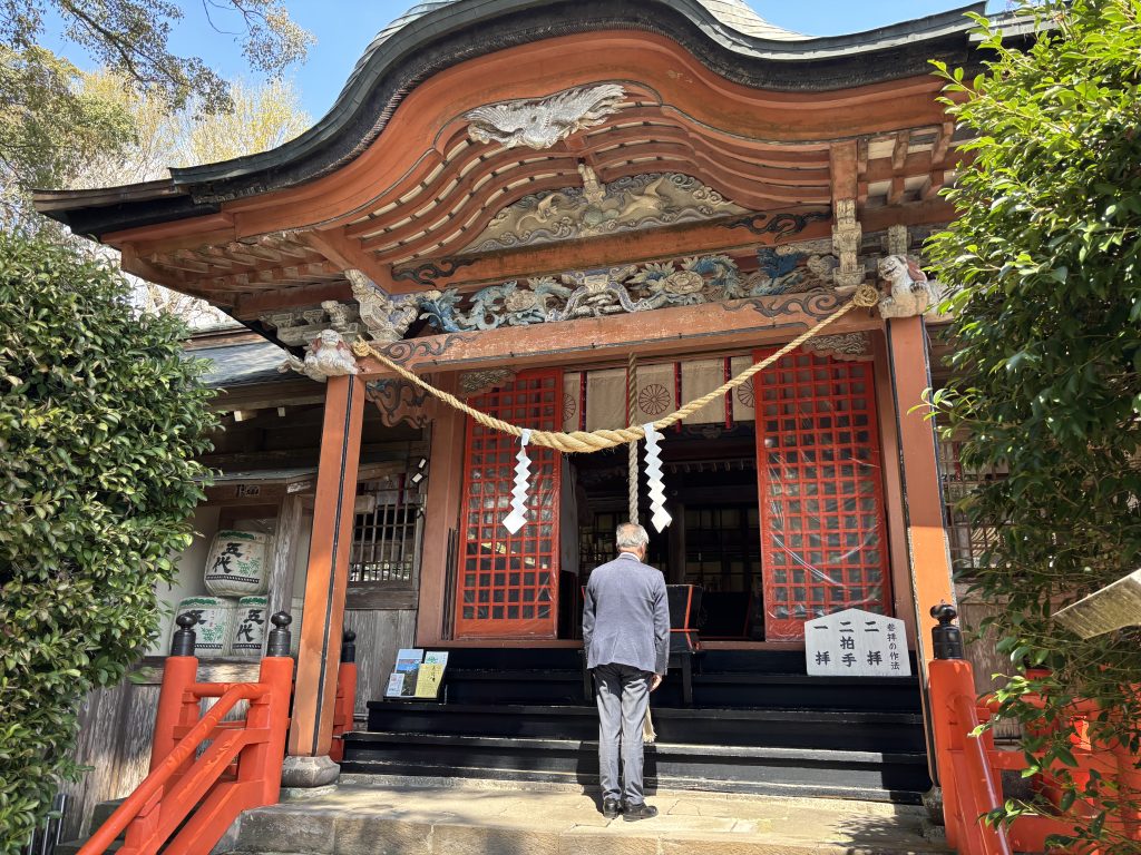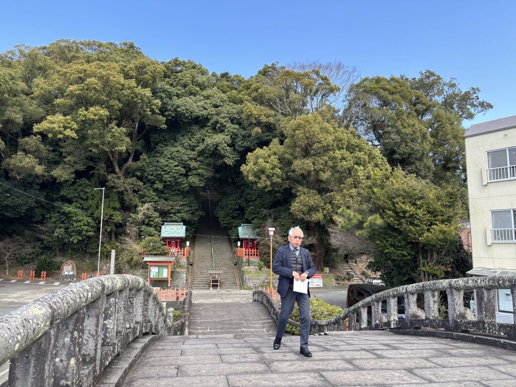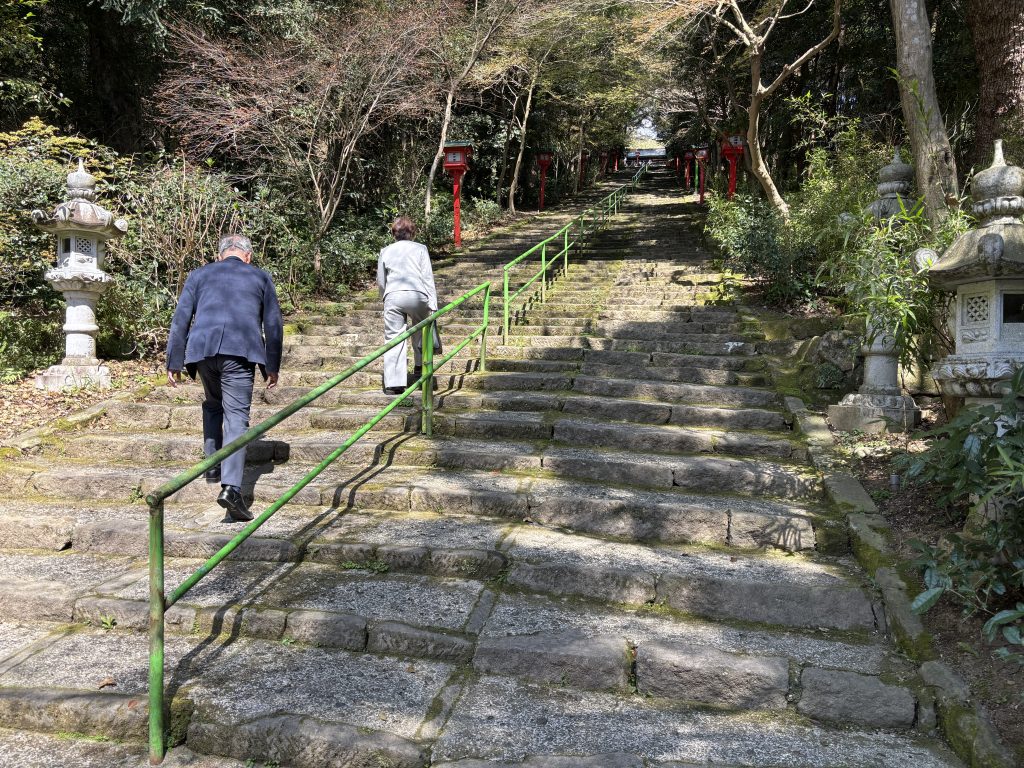 帰りに、薩摩国一の宮である「新田神社」へ参拝しました。天照皇大御神の孫である天津日高彦火瓊瓊杵尊(ニギギノミコト)が御祭神です。新田神社の社殿は神亀山(しんきさん)という亀の形をした小高い山の上にあります。車で途中まで行けるのですが、せっかくなのでと我々は1番下から登ります※後半は皆無口…300段以上あるそうです。